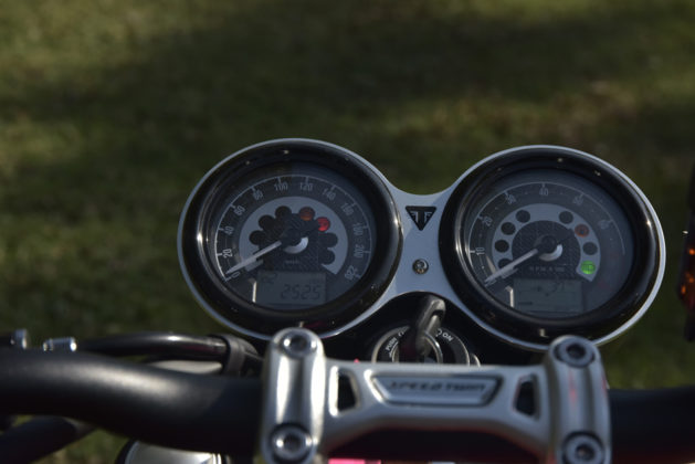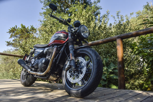 Power is frustrating without control. The Speed Twin rolls on a 160/60×17 back tyre with a 120/70×17 in the front. Simple and handsome seven spoke magnesium wheels are shod with Pirelli’s brilliant Corsa Rosso 3’s. Conventional, right side up front forks of 41mm are allied to twin back shocks with which they share 120mm of travel. The ride is amazingly supple, yet controlled.