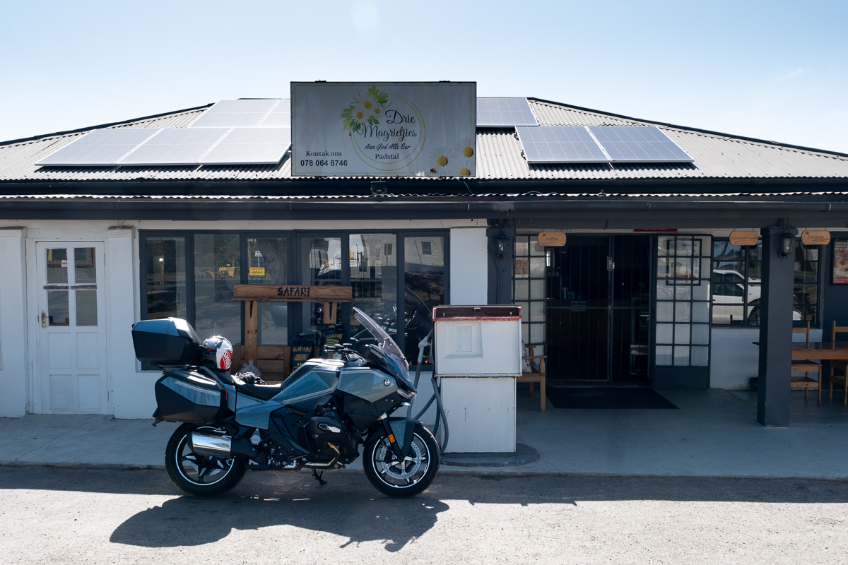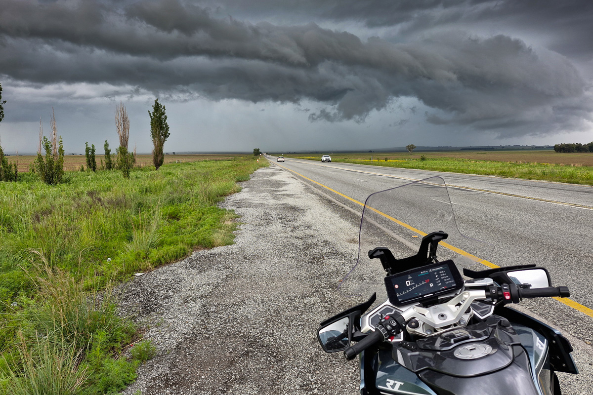 The heavens opened outside Kroonstad, and riding at 100 km/h was simply not an option. It rained so hard that the front radar gave an error – it simply could not pierce the water to see ahead, so it assumed the worst. When I cleared the worst of the storm, everything on me and around me was soaked. I switched on the heated seat and grips to ward off the cold, and just kept going. I reached Pretoria long before sunset, and here I rode into another cloudburst, this time with the added challenge of late afternoon traffic.