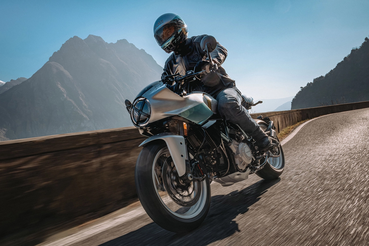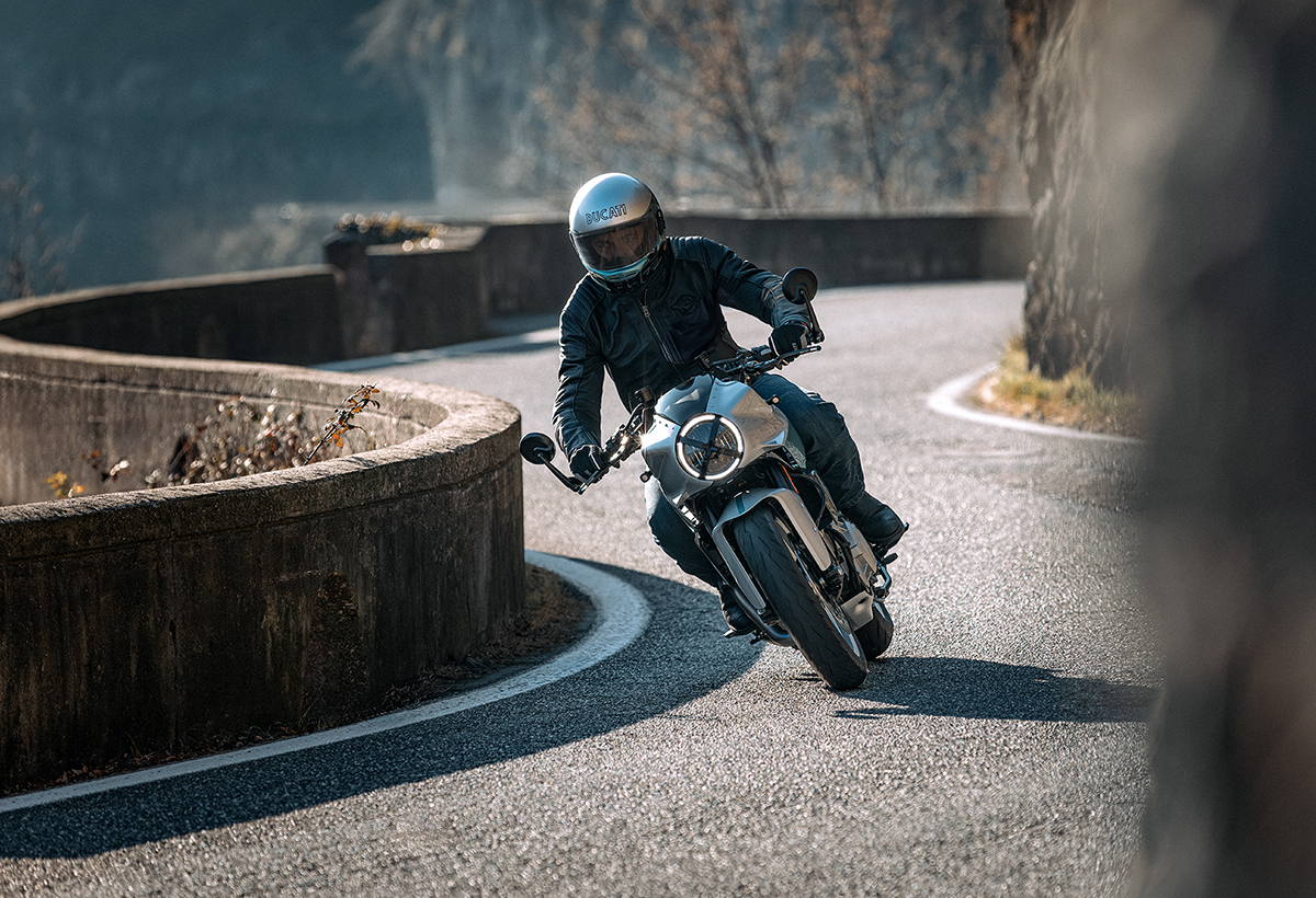 The most obvious styling elements are the nose cowl with a single round LED headlight and not-too-extreme clip-on handlebars. The petrol tank graphics mirror the see-through strip in the glass-fibre tank of the original Paul Smart model, which was used to check the fuel level.