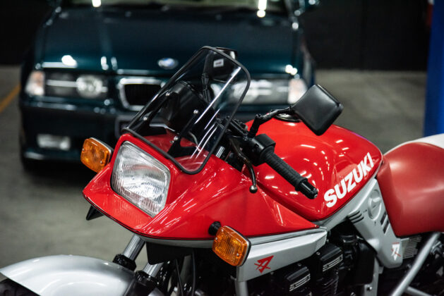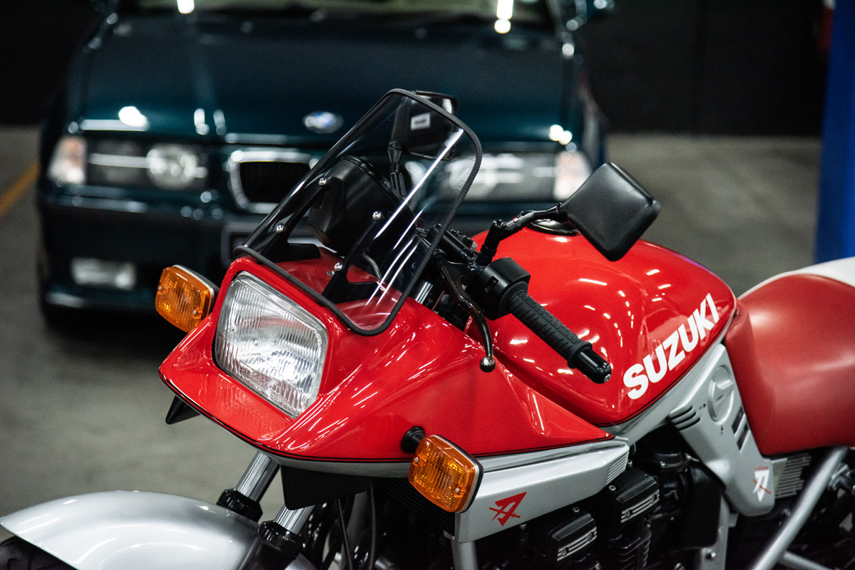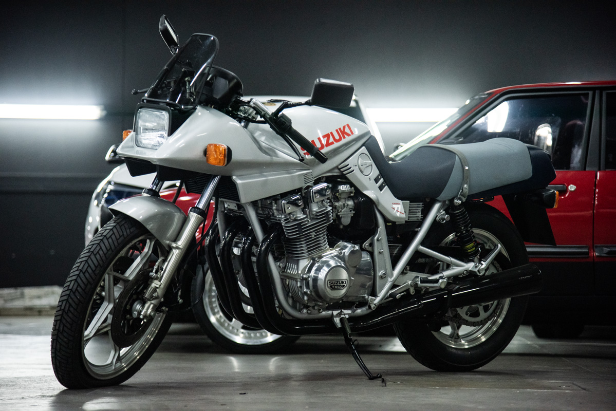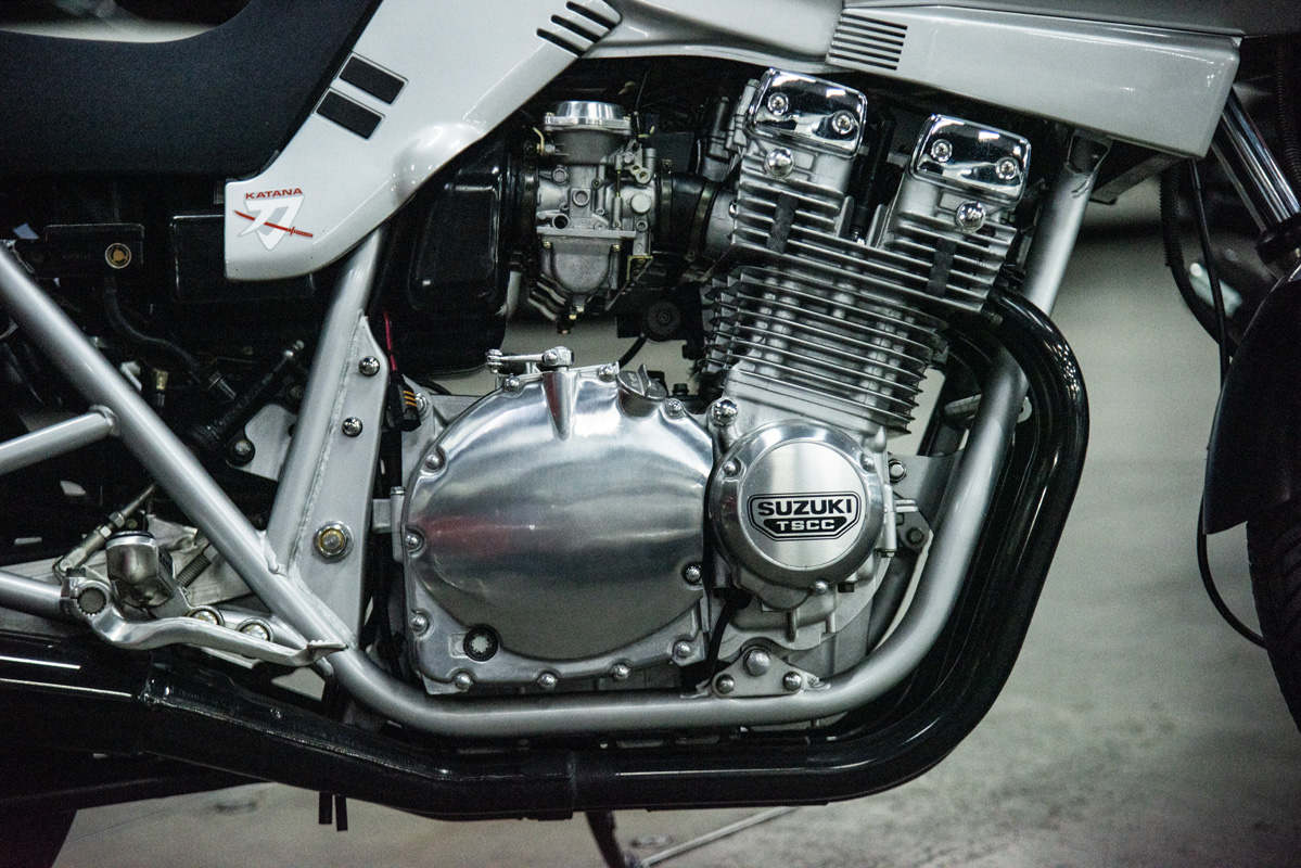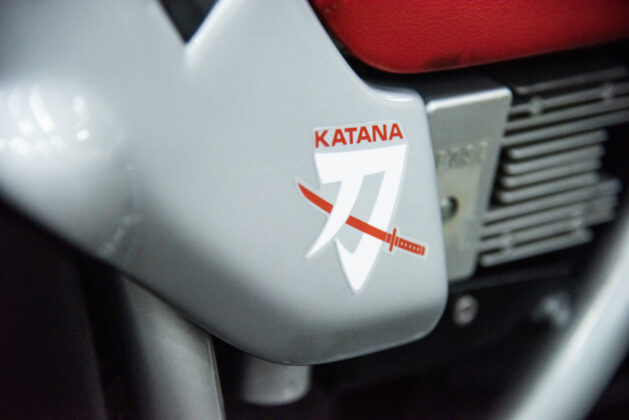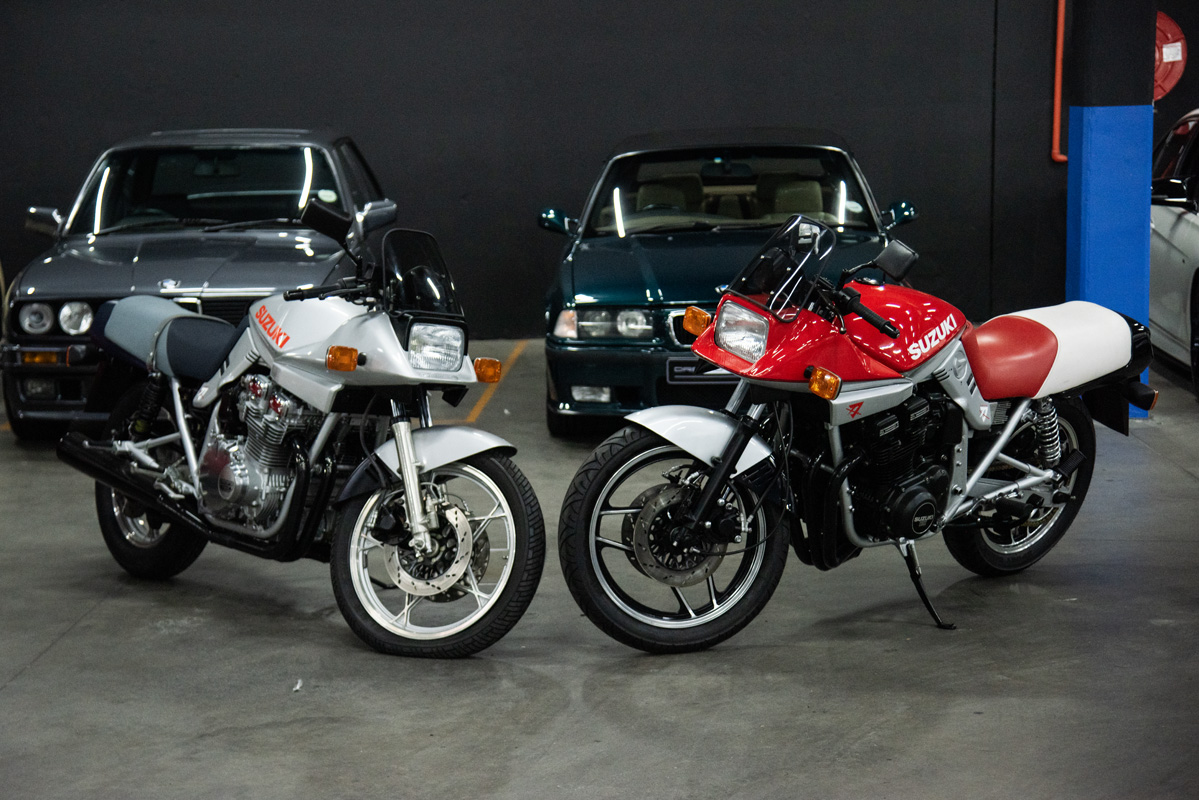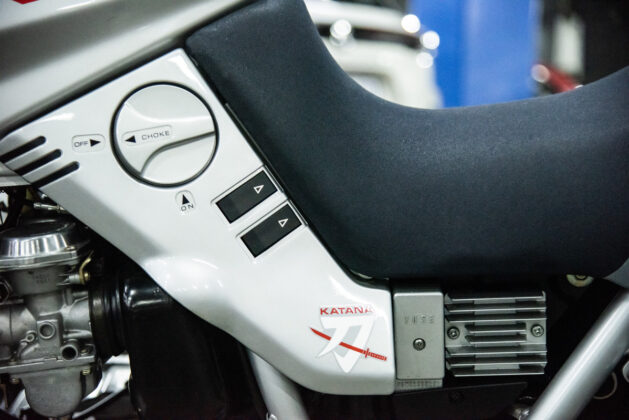The two 1100s at Bikeshop are stunning. The one is in the classic Katana silver paint scheme with a blue and silver two-tone seat. It also has the star-shaped silver mag wheels. The other is in a stunning red and white scheme, and it has the black wheels with polished highlights as offered on the American GSX1100EZ. The silver bike has the original exhausts, whereas the red Kat has a four-in-one fitted. This is an opportunity to own an incredible piece of motorcycle nostalgia.