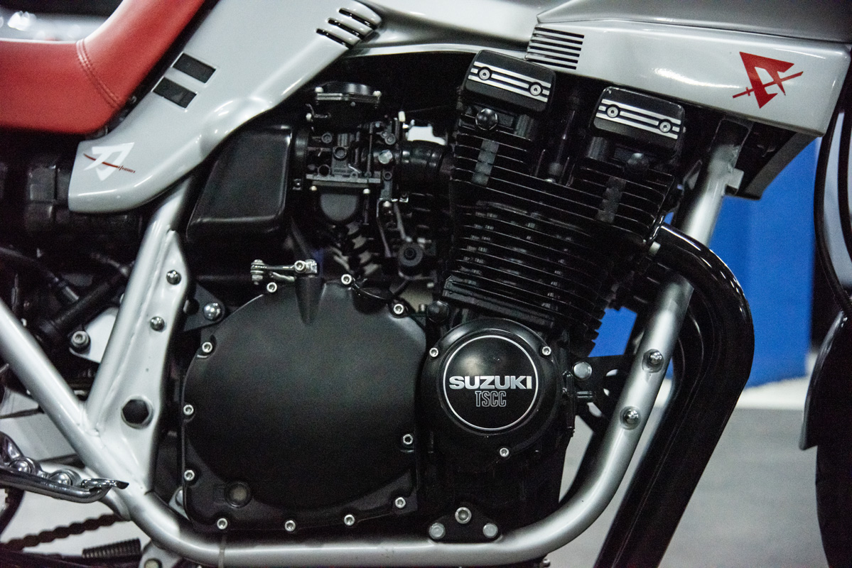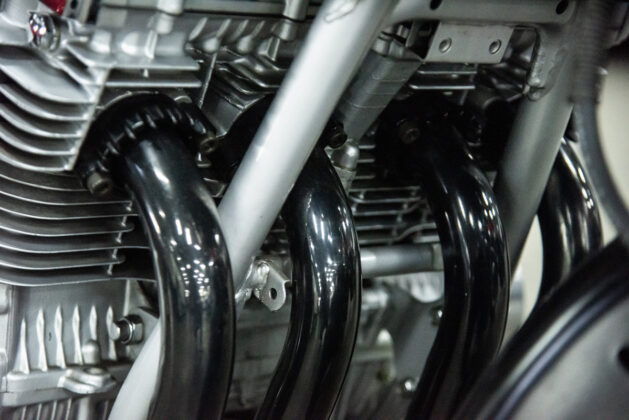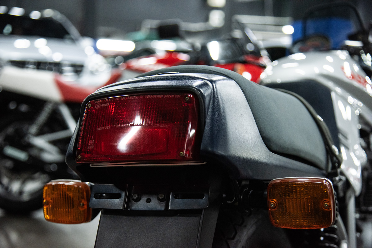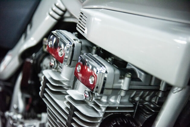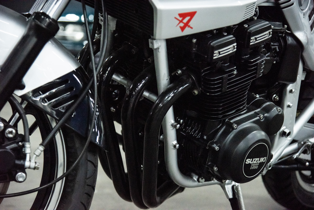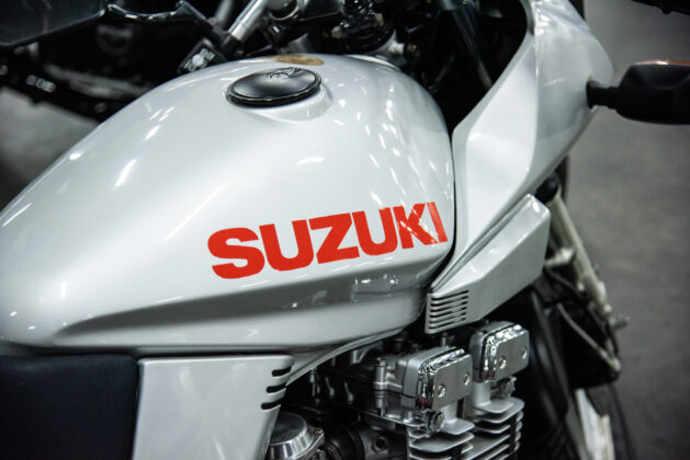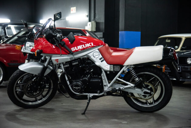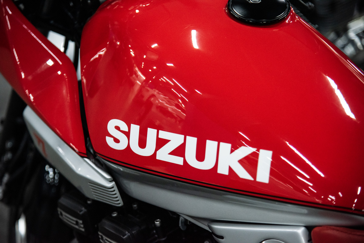 The two 1100s at Bikeshop are stunning. The one is in the classic Katana silver paint scheme with a blue and silver two-tone seat. It also has the star-shaped silver mag wheels. The other is in a stunning red and white scheme, and it has the black wheels with polished highlights as offered on the American GSX1100EZ. The silver bike has the original exhausts, whereas the red Kat has a four-in-one fitted. This is an opportunity to own an incredible piece of motorcycle nostalgia.