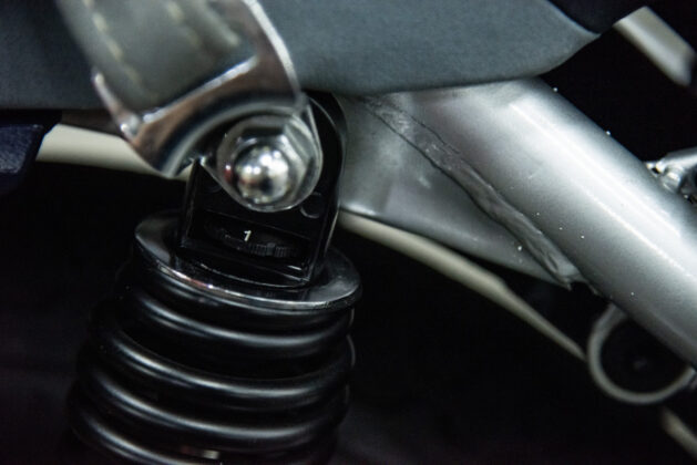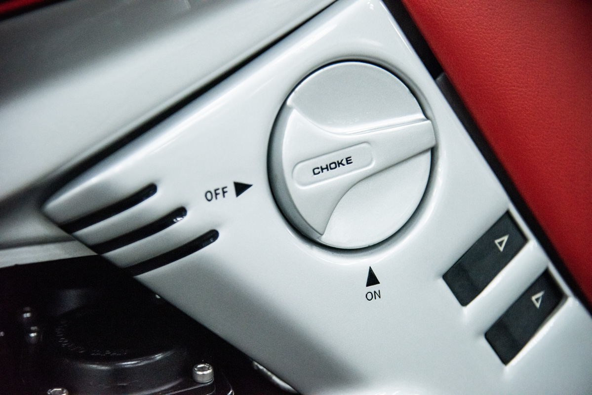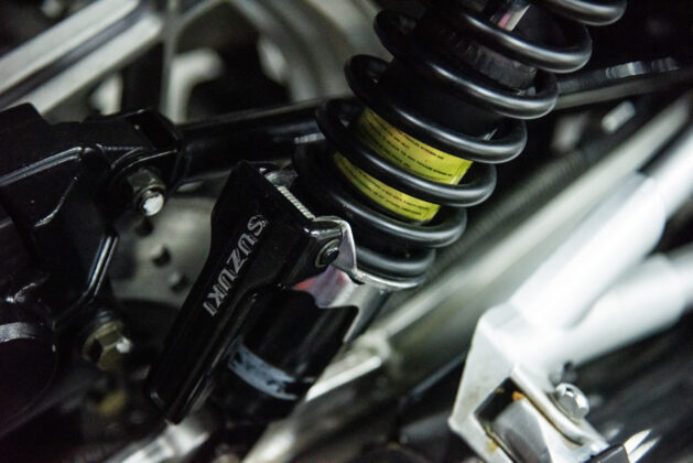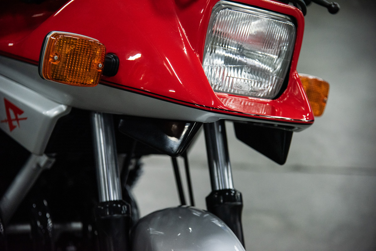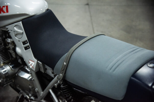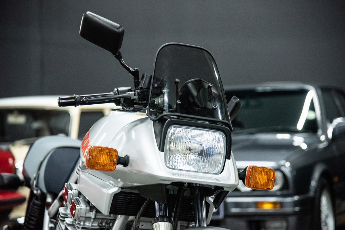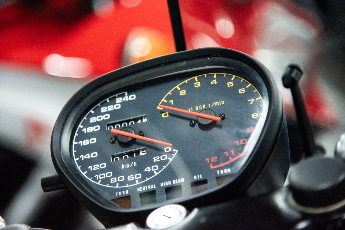 The two 1100s at Bikeshop are stunning. The one is in the classic Katana silver paint scheme with a blue and silver two-tone seat. It also has the star-shaped silver mag wheels. The other is in a stunning red and white scheme, and it has the black wheels with polished highlights as offered on the American GSX1100EZ. The silver bike has the original exhausts, whereas the red Kat has a four-in-one fitted. This is an opportunity to own an incredible piece of motorcycle nostalgia.