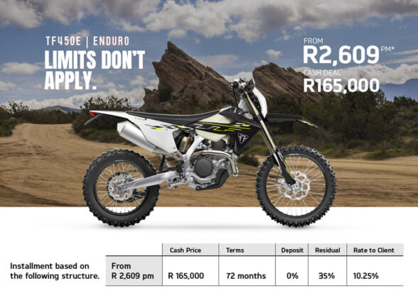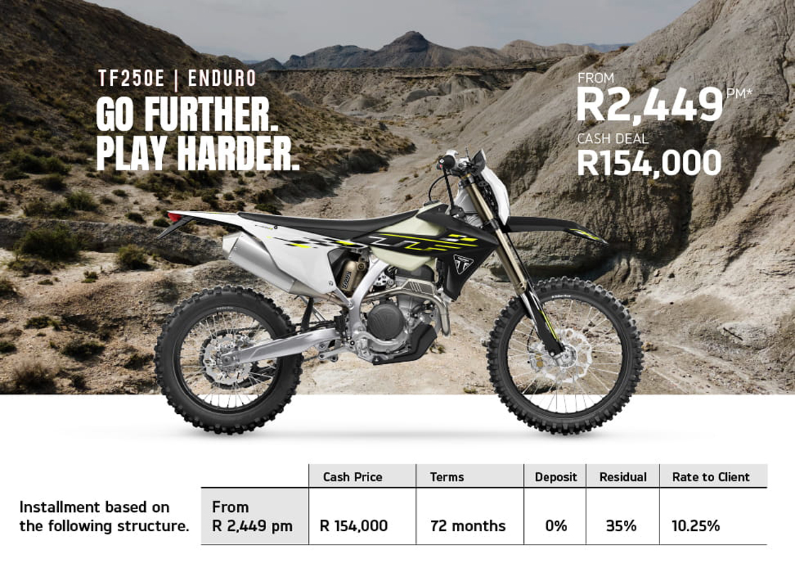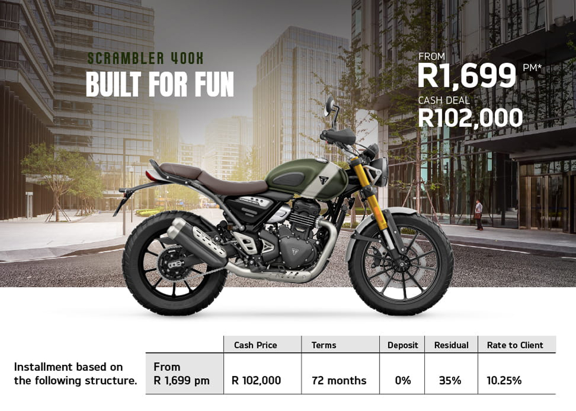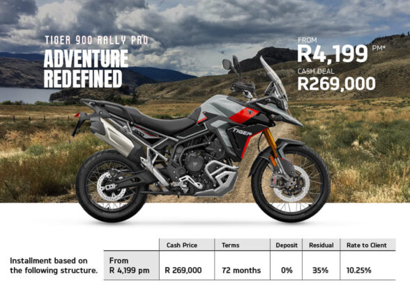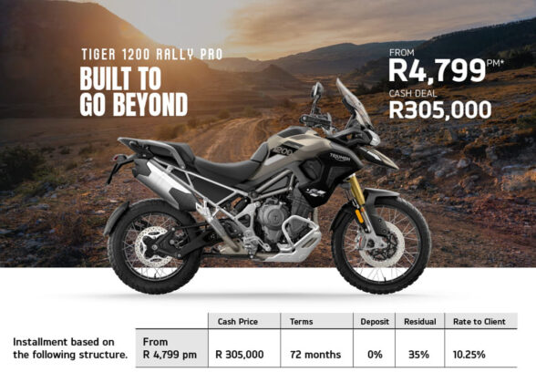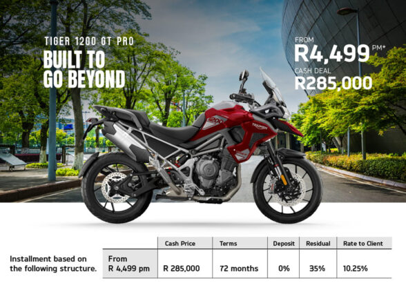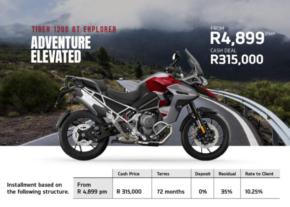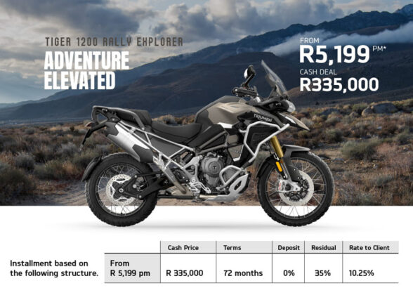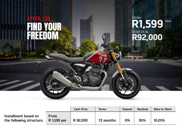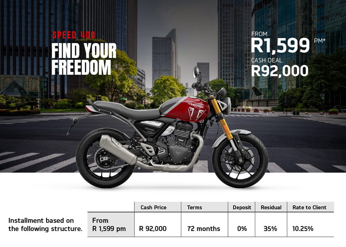 If your dream is to own a Triumph, then there is some very good news. Triumph is offering deals on the 400 cc, Street Triple and Tiger 900 and Tiger 1200 models, all with an average of 3% below prime interest when financed over 72 months. That means you can get your hands on a Speed 400 for a measly R1,599 per month or, at the other end of the scale, a Tiger 1200 Rally Explorer for R5,199 a month, with many offers in between.